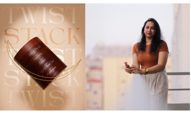 The design allows multiple makeup products to be stacked into one compact unit, simplifying everyday routines while reducing unnecessary packaging waste.